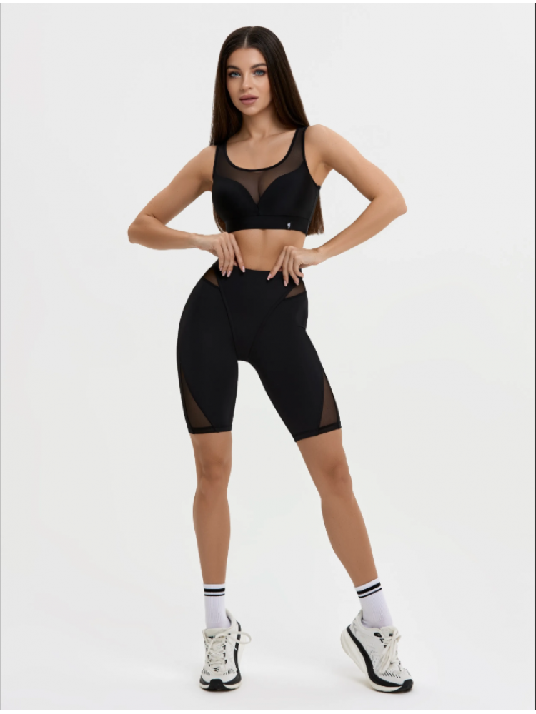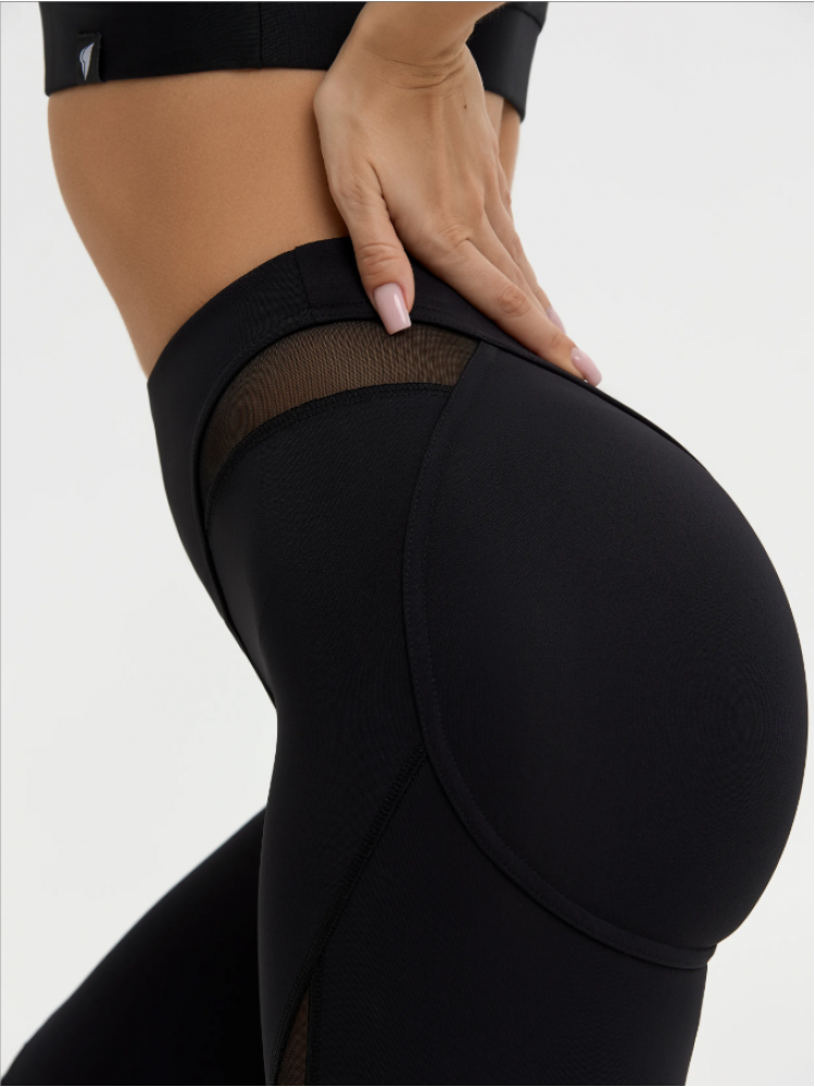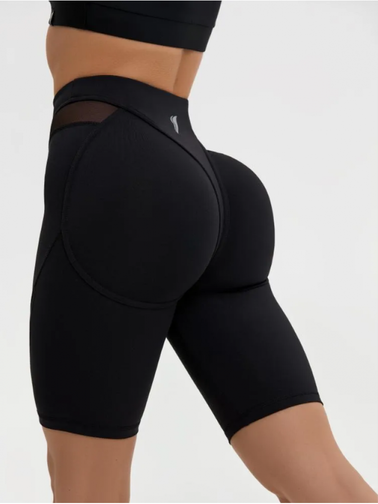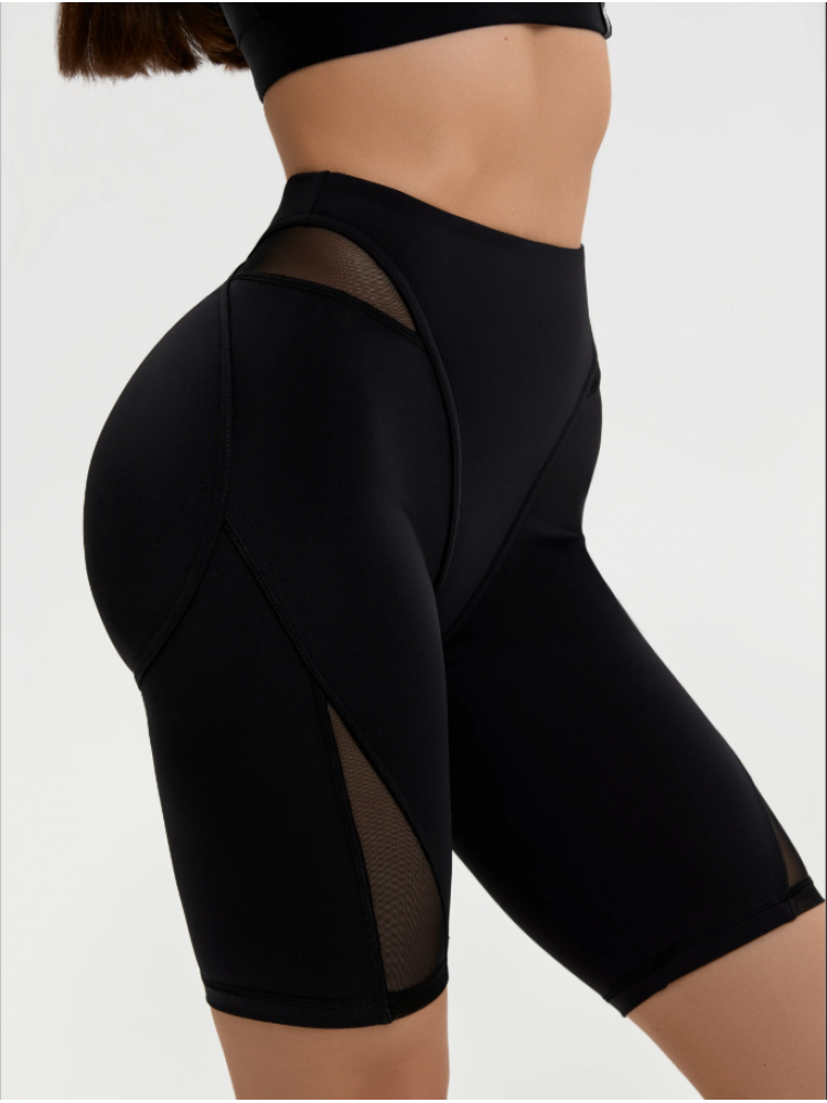 Обтягивающие женские шорты до колена с завышенной талией оснащены дополнительными вставками из сетки, которые визуально вытягивают силуэт, подчеркивая все ваши достоинства фигуры.